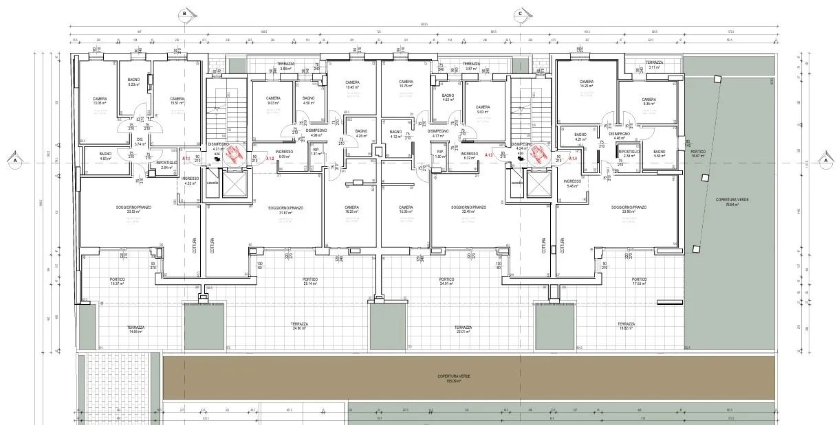 Appartamento trivano/quadrivano composto da ampio open-space nella zona giorno e angolo cottura, camera matrimoniale, una o due camerette, due bagni e terrazza con portico.